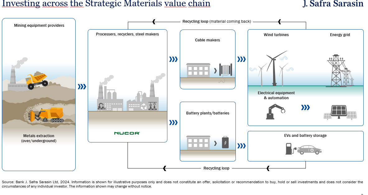 Beleggen in de waardeketen van strategische materialen helpt deze risico’s te beperken en zorgt voor diversificatie, wat de prestaties in verschillende fasen van de cyclus ten goede komt. We passen deze benadering van de waardeketen toe op onze thematische aandelenfranchise. Voor strategische materialen richten we ons specifiek op drie groepen bedrijven: metalen en recycling, eindgebruikers en geavanceerde materialen en andere hulpbronnen.