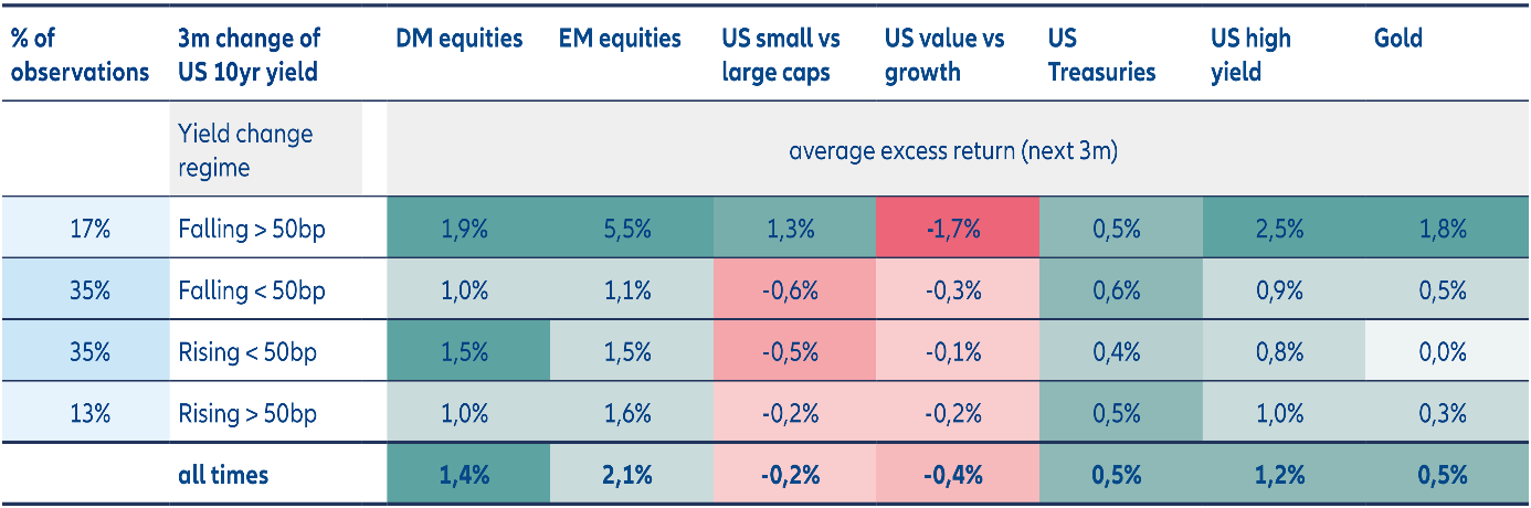 Om te begrijpen wat forse verschuivingen in rendementsregimes zouden kunnen betekenen voor beleggers, keken we naar de gemiddelde overrendementen over drie maanden in verschillende activaklassen in reactie op verschillende veranderingen over drie maanden in de rente op 10-jaars Amerikaanse staatsobligaties.