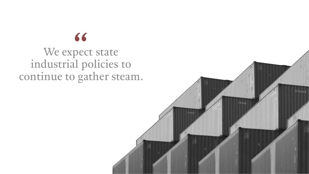 In the US, the Inflation Reduction Act (IRA) and the Chips & Science Act, both passed in 2022, have brought back industries qualified as strategic by the Biden administration to the US. Investments in electric vehicle (EV) batteries, semiconductors and clean energy production in the US have increased significantly, creating a new infrastructure boom. In Europe too we are seeing active, state-driven industrial policies reappear, notably in the area of semiconductors. But after the loss of cheap Russian gas, the continent is suffering from a higher cost of energy than the US. Moreover, some European industries are increasingly challenged by cheaper imports from China as Chinese companies try to compensate for domestic overcapacity by exporting. Overall, we expect state industrial policy to further gather steam, driven by increased expenditure on defence capabilities.