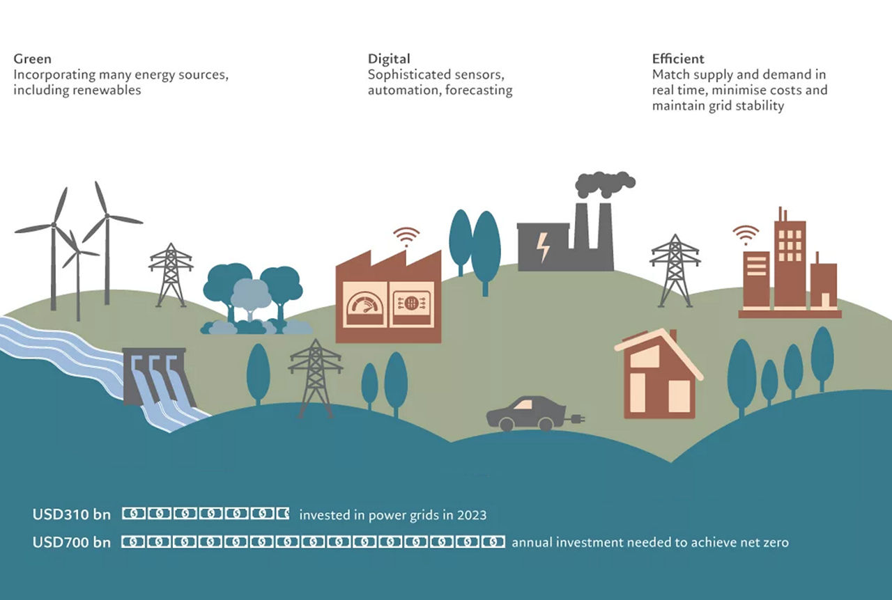 A greener planet needs significantly more electricity – and from clean sources. To achieve that, we need a smarter power grid. The International Energy Agency (IEA) estimates that to meet net zero emission goals, we need to build or modernise 25 million kilometres of electricity grids in the next five years.3 Firstly, the increased use of renewables requires investing in network interconnections to transport power from remote solar- and wind-rich areas to demand centres and connect renewable energy production to the grid. Secondly, sector electrification such as the rise of electric vehicles and heat pumps will increase electricity demand, requiring grid reinforcement and modernisation. Thirdly, grids will need to be able to withstand extreme weather events resulting from climate change to avoid power outages.