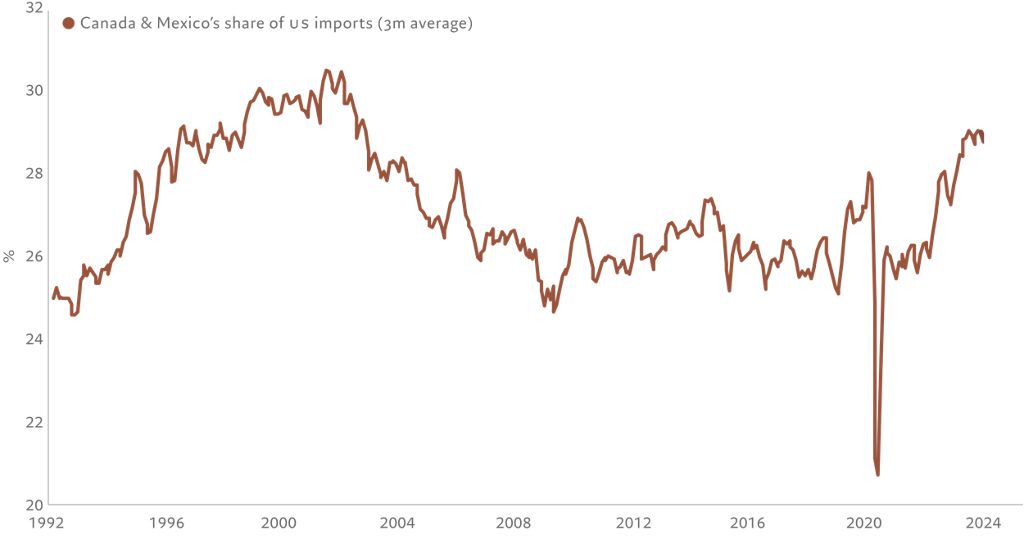 Mexico’s exports to the US surpassed China’s for the first time in 20 years in 2023 (chart 2A). Together, Mexico and Canada’s share of US imports has risen sharply since early 2022, reversing a two-decade-long decline (chart 2B).