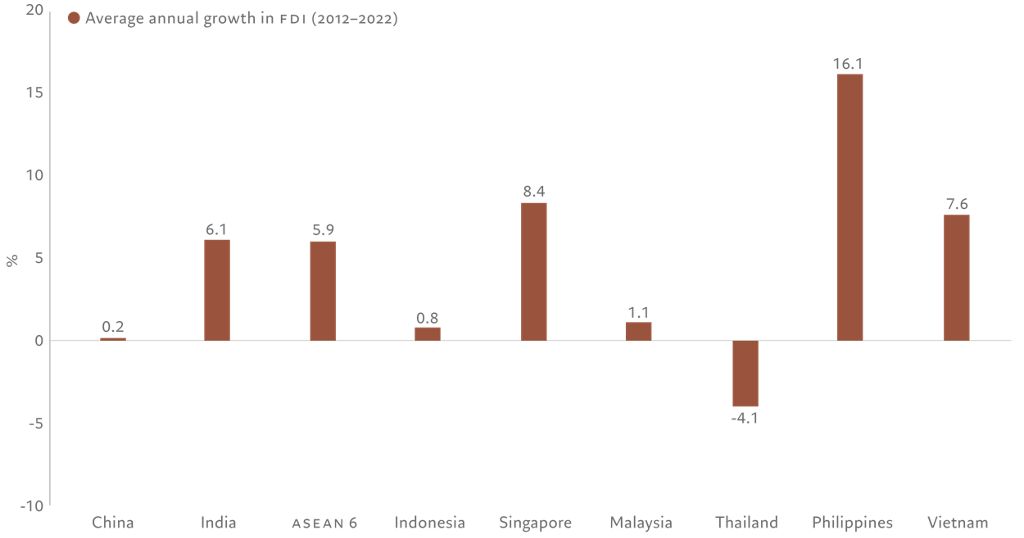 The migration of supply-chains to the ASEAN economies is reflected in strong inflows of foreign direct investment (FDI ) into the region. According to the World Bank, FDI inflows into the six largest ASEAN economies (Indonesia, Singapore, Malaysia, Thailand, the Philippines and Vietnam) rose by 78.2% over the decade ending 2022 (at a compound annual growth rate (CAGR ) of 5.9%), with the Philippines, Singapore and Vietnam the biggest beneficiaries (chart 1). In the years 2012-21, the six major ASEAN countries’ exports grew by 41%, much higher than global export growth of 22%.