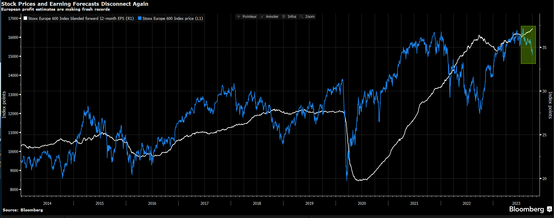 Néanmoins, le déclin des indices actions s’installe, lentement mais surement depuis le début du mois et la décorrélation s’accentue entre les cours boursiers en repli et les perspectives de croissance bénéficiaire en Europe encore portées au sommet par des attentes peut-être trop optimistes.