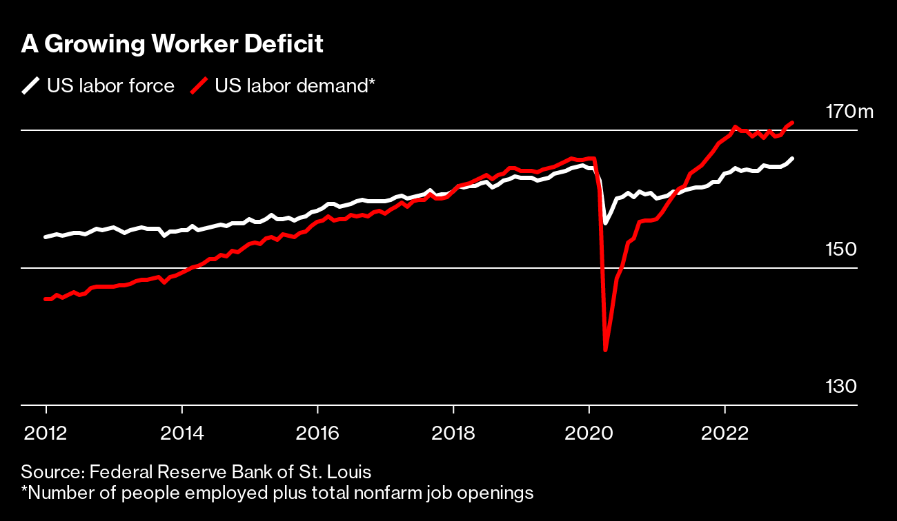 En janvier, il y avait encore 5,1 millions d’offres de plus qu’il n’y avait de demandeurs de postes, selon la FED de Saint-Louis. La main-d’œuvre manque sur le chantier de la nouvelle usine de semiconducteurs d’IBM. Certaines compagnies de construction déploient leurs employés en jet privé quand elles ne peuvent trouver de travailleurs localement. Tout semble laisser penser que la Covid 19 fut davantage un accélérateur que la cause principale du déficit de travailleurs.
