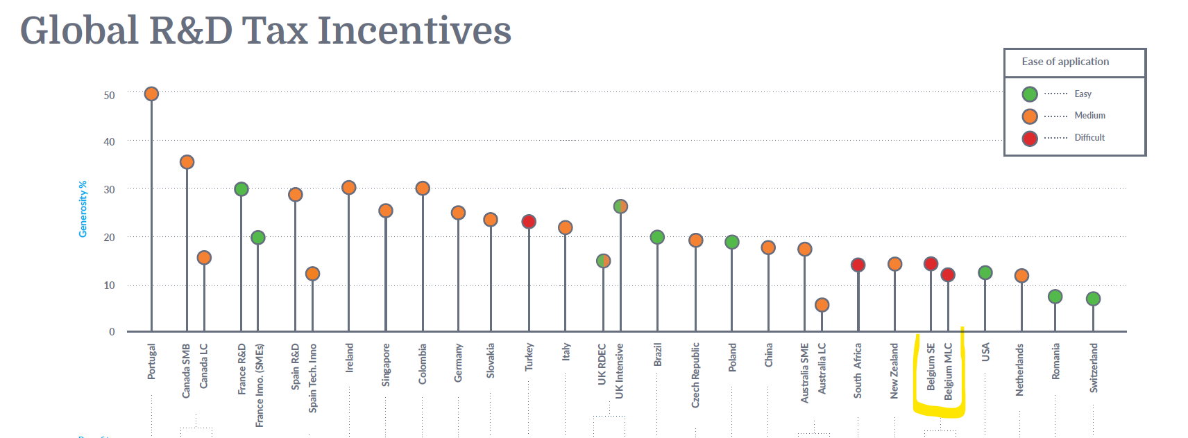 Volgens de scores van de studie bedraagt de vrijgevigheid in België 13% voor kleine bedrijven en 11,3% voor andere. Ter vergelijking: onze buurlanden bieden bijvoorbeeld 30% in Frankrijk, 25% in Duitsland, 29,6% in Spanje en zelfs 49,4% in Portugal. De Verenigde Staten trekken dan weer kleine bedrijven voor, met 36,1% vergeleken met 16,6% voor anderen, maar met een eenvoudige aanvraagprocedure voor financiering.